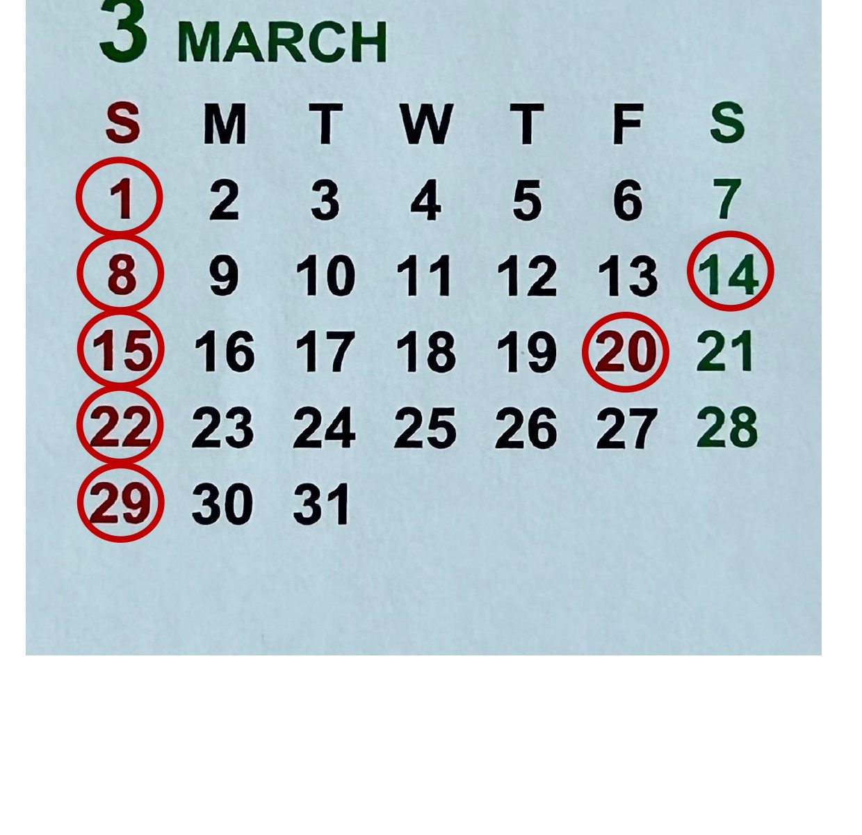 3月のお休みは通常通り、日曜、祝日、第2土曜日でございます。