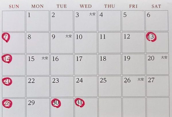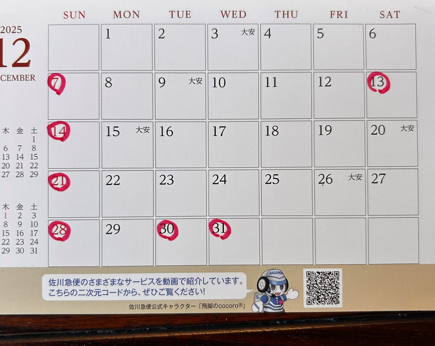 さて、12月のお休みは、日曜、祝日、第2土曜日と年末30日31日となります。
