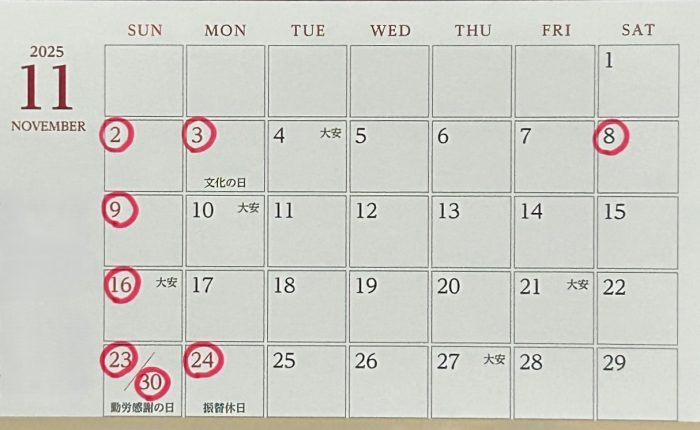 さて、11月のお休みは通常通り、日曜、祝日、第2土曜日でございます。
